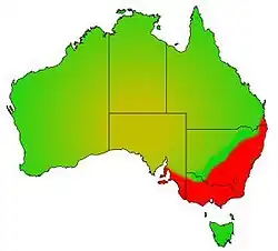 Mountain galaxias occupies a vast geographical range from southern Queensland to the Adelaide Hills in South Australia, and while occurring widely in the Murray-Darling river system, are also found in eastern and southern coastal systems. How much of their coastal distribution is due to natural river capture events (although it is certain much of it is) and how much of it may be due to migration is not clear, for many mountain galaxias species have the ability to "climb" natural migration barriers with modified pelvic fin structures.[2][3] Individual species within the complex have ranges varying from across almost the entire range of the complex itself down to extremely restricted ranges within a single or only a very small number of catchments.[2]