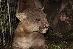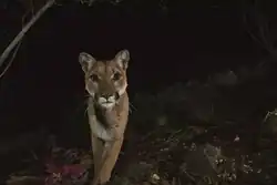 The Santa Monica Mountains mountain range, part of the Transverse Ranges in Los Angeles and Ventura counties, is known for its population of mountain lions (Puma concolor). Mountain lions in the Santa Monica Mountains are one of only two instances of large wild cats living in a megacity, the other being leopards in Mumbai, India.[1][2] The most notable mountain lion in the range was P-22, which lived in Griffith Park, was photographed in front of the Hollywood Sign, and was featured on the cover of National Geographic.[3]