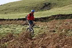 Mountain unicycling is an adventure sport that consists of traversing rough terrain on a unicycle. Mountain unicycling (muni or municycling) is undertaken on similar terrain to mountain biking. However, muni requires much more attention to the microfeatures of the short distance in front of the wheel.[1] Unicycles' lack of a freewheel means that descents must be controlled all the way, and the typical lack of a gear system (though two-gear hubs are available) prevents the rider from reaching high speeds. Muni usually takes place on specially designed unicycles, which are equipped with strong hubs, large, knobbly tires, high-grip pedals and rugged frames.[2] Some are also equipped with rim or disc brakes, having the lever mounted under the nose of the saddle. The brake primarily helps to compensate the downhill-slope force, while more expert riders also use it to decelerate or stop.[3]