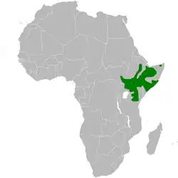 This species has an extensive range in Ethiopia, Kenya, Somalia, South Sudan, Tanzania, and Uganda, with an estimated global Extent of Occurrence of 550,000 km2.[1] Its natural habitats are dry savannah and subtropical or tropical dry shrubland.