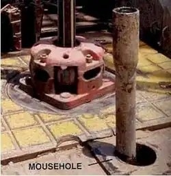 The mousehole is the storage area on a drilling rig where the next joint of drilling pipe is held until needed. This hole is in the floor of the rig, bored into the earth for a short way, and usually lined with a metal casing known as a scabbard.