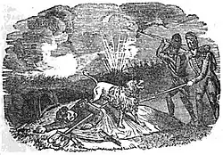 Moustache is said to have left the cuirassiers after he was struck by a cavalryman with the flat of his sword.[12] De Fivas says that he attached himself to a unit of dragoons which he followed to Spain, taking part in two campaigns with them during which he would walk ahead of their column and bark warnings whenever he heard a noise.[12] During a battle in the Sierra Morena mountain range in southern Spain Moustache is alleged to have led back to camp the horses of dragoons killed on the battlefield.[12] Shortly after this he is said to have been secretly taken by a Colonel who wished to own him. After spending seventeen days in captivity the dog apparently escaped by an open window and joined with a gunboat crew.[12] Afterwards he participated in the Battle of Badajoz where he was struck by a cannonball and killed on 11 March 1812, at the age of twelve years.[nb 1]