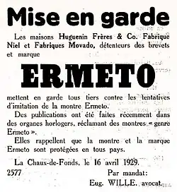 Houses Hugenin Frères & Co. Fabrique Niel and Fabriques Movado, holders of the patents and brand ERMETO warn all third parties against attempts to imitate the Ermeto watch. Publications have recently been made in watchmaking bodies, claiming <<Ermeto type>> watches. They are reminded that the watch and the brand Ermeto are protected in all countries. La Chaux-de-Fonds, 16 April 1929. Translated from the French.