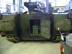 The AIFV (armored infantry fighting vehicle) Mowag Trojan was built as a prototype and tested in the New IFV program NSpz (Neuer Schützenpanzer) for Switzerland in 1990. The NSpz was intended to replace the M113 used by the Swiss Army. It was first equipped with the Steyr SP 3E/300 turret, and later with the Oerlikon GBA COA turret. It was equipped with various technological innovations such as outside lying fuel tanks, preheating and heating system, compartmentalized additional armor on the sides, which could be easily upgraded, splinter protection in the interior and s hydraulic rear ramp with integrated door and side protection. Due to financial shortages in the military budget, procurement should be begin with almost 10 years delay. MOWAG was not able to keep the production for the Trojans so long unused. Mowag participated no more in the second, later selection of NSpz, now called Schützenpanzer2000 (SP2000) in 1998 to 1999. The Swiss Army then purchased the Swedish CV90. The Trojan was the last tracked vehicle made by the company MOWAG . The Trojan was until 2005 owned by the company MOWAG. It is now at the Military Museum Full. [1] [2]