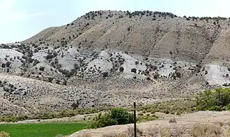 ![]() Characteristic white or silvery colored Mowry Shale below the Mancos Shale, west of Dinosaur National Monument. | |