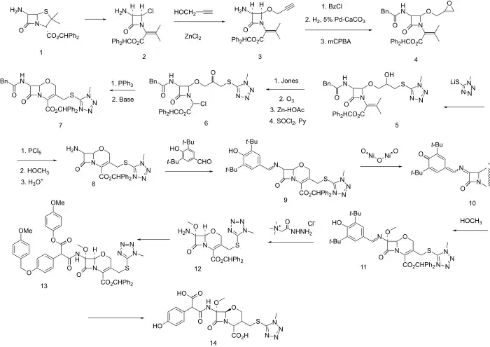The benzhydrol ester of 6-Aminopenicillanic acid (6-APA) is S-chlorinated and treated with base whereupon the intermediate sulfenyl chloride fragments (to 2). Next, displacement with propargyl alcohol in the presence of zinc chloride gives predominantly the stereochemistry represented by diastereoisomer 3. The side chain is protected as the phenylacetylamide; the triple bond is partially reduced with a 5% Pd-CaCO3 (Lindlar catalyst) and then epoxidized with mCPBA to give 4. The epoxide is opened at the least hindered end with 1-methyl-1H-tetrazole-5-thiol to put in place the future C-3 side chain and give intermediate 5. Jones oxidation followed in turn by ozonolysis (reductive work-up with zinc-AcOH) and reaction with SOCl2 and pyridine give halide 6. The stage is now wet for intramolecular Wittig reaction. Displacement with PPh3 and Wittig olefination gives 1-oxacephem 7. Next a sequence is undertaken of side chain exchange and introduction of a 7-methoxyl group analogous to that which is present in cephamycins and gives them the enhanced beta-lactamase stability. First 7 is converted to the imino chloride with PCl5 and then to the imino methyl ether (with methanol) and next hydrolyzed to the free amine (8). Imine formation with 3,5-di-t-butyl-4-hydroxybenzaldehyde is next carried out leading to 9. Oxidation with nickel(III) oxide gives iminoquinone methide 10, to which methanol is added in a conjugate sense and in the sterechemistry represented by formula 11. The imine is exchanged with Girard's reagent T to give 12, and this is acylated by a suitable protected arylmalonate, as the hemiester hemiacid chloride so as to give 11. Deblocking with aluminium chloride and anisole gives moxalactam 14.
