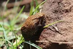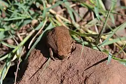 The Mozambique rain frog (Breviceps mossambicus), also known as the flat-faced frog, is a species of frog in the family Brevicipitidae.[2] It is found in Botswana, Democratic Republic of the Congo, Eswatini, Malawi, Mozambique, South Africa, Tanzania, Zambia, Zimbabwe, and possibly Lesotho. Its natural habitats are dry savanna, moist savanna, temperate shrubland, subtropical or tropical dry shrubland, temperate grassland, subtropical or tropical dry lowland grassland, subtropical or tropical high-altitude grassland, arable land, pasture land and rural gardens.[1]