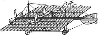 Mozhaysky's airplane (Russian: Самолёт Можайского) was an experimental Russian airplane designed and built by a naval officer Alexander Mozhaysky (also transliterated as Mozhayskiy, Mozhayski, Mozhaiski and Mozhaisky).[1] Powered by two steam engines, the monoplane design reputedly made a powered take off assisted by the use of a ramp, flying between 20 and 30 m (66–98 ft) near Krasnoye Selo, Russia in 1884.