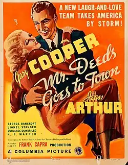 Mr. Deeds Goes to Town is a 1936 American comedy-drama romance film directed by Frank Capra and starring Gary Cooper and Jean Arthur in her first featured role. Based on the 1935 short story "Opera Hat" by Clarence Budington Kelland, which appeared in serial form in The American Magazine, the screenplay was written by Robert Riskin in his fifth collaboration with Capra.[2][3]