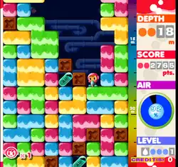 Susumu has an oxygen meter at the right-hand side of the screen, which constantly depletes as the game progresses — Susumu can replenish part of his oxygen meter by collecting air capsules found throughout the game.[4] Susumu will lose a portion of his oxygen if he drills brown "X-Blocks", which take five hits to destroy, and will lose a life if his meter reaches 0%.[4] A skull-and-crossbones symbol will appear over Susumu's head if his oxygen dips under 30% as a warning sign.[4] The home console versions of the game add two new game modes, a "Time Attack" mode where Susumu must constantly collect clocks to reduce his elapsed time, and a "Survival Mode" where the player must drill as much as they can before dying.[5]