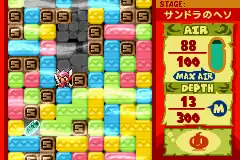 Mr. Driller A is a puzzle game similar to Puyo Puyo (1990) and the classic arcade game Dig Dug (1982).[1] Players choose from one of seven characters to play as: Susumu Hori, the protagonist; Ataru Hori, Susumi's self-contained older brother; Taizo Hori, the protagonist of Dig Dug; Puchi, Susumu's dog; Anna Hottenmeyer, a rival driller from Germany; and Holinger-Z, a drilling robot.[2] In each level, players must make it to the bottom of a well by destroying, or "drilling", colorful formations of blocks.[2] Destroying blocks results in those above it falling and connecting with similarly-colored ones; should four or more matching blocks connect, they will be destroyed, which is useful for creating chain reactions. Blocks will also fall if there is nothing underneath to support them, which can crush players that are underneath them. Players will need to manage their constantly-depleting oxygen, which acts as both a health bar and a timer. Oxygen is replenished by collecting blue air capsules, while oxygen is lost by destroying brown X-marked blocks. If a player is next to a block with an open space above it, they can "jump" up that block.[2]