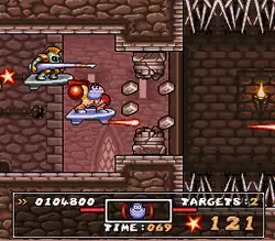 The player controls Mr. Tuff throughout six areas divided into multiple buildings that correspond to a level, where the main objective of each is to destroy a predetermined number of targets within a given time limit to open the exit and advance to the next level.[5][8][9][10] Each building can be played in any order and after each one is destroyed, the player must confront a boss before moving into the next area.[5][8][9] There is also a secret island that can only be accessed by finding 30 coins hidden in bonus rooms on each level.[4][10] The player must maneuver Mr. Tuff by jumping across ledges and fighting enemies, exploring and searching for items and power-ups, while also collecting stars scattered around the levels.[1][5][6][8][9]
