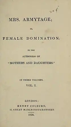 Mrs. Armytage; or Female Domination is an 1836 novel by the British writer Catherine Gore, originally published in three volumes. It is a silver fork novel focusing on fashionable high society, a popular genre to which Gore contributed several books.[1][2] The novel functions as an analogy for the contemporary political situation, with Gore advancing a pro-Whig viewpoint.[3] It was very successful on its release, and was reissued by Gore's publisher Henry Colburn in 1848.[4]