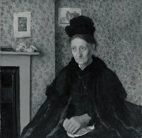 Simon Schama writes that she is "glancing anxiously sideways, uncertain of what is wanted of her."[2] The painting was exhibited at the New English Art Club in the spring of 1900, marking a strong phase of her career that also saw her Self-portrait on display there about that time.[3] It is considered among the "carefully executed tonal paintings of rather detailed genre subjects" in her first mature oil works.[4]