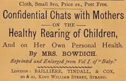 In 1890, Bowdich published Confidential Chats with Mothers: On the Healthy Rearing of Children, a revision and enlargement of articles previously published in Baby: The Mother's Magazine.[10] Her advice was based on her own experiences as a mother:[11]