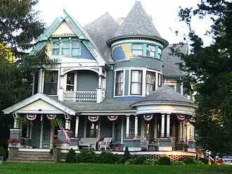 The Mrs. Lydia Johnson House is a historic residence located in Maquoketa, Iowa, United States. This house is a fine example of Queen Anne style architecture in the United States. It was built during the economic boom years in the city's development.[2] Built in 1895, the two and one half storey house features a complex irregular composition, a corner tower, wrap-around porch, a small porch on the second floor above the main porch, various window shapes and sizes, and textured wall surfaces on the exterior. Little is known about the Johnson family who built it, but its notability is derived from the architecture.[2] The house was listed on the National Register of Historic Places in 1991.[1]