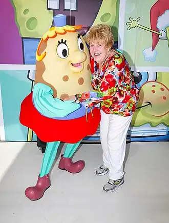Theme parks and events have featured Mrs. Puff, often as a costumed character. She was included on a boating school float as part of Sea World Australia's SpongeBob ParadePants parade, which opened in December 2011.[61] She appeared at Universal Studios Hollywood's "SpongeBob Fan Shellabration" in 2013,[62] and at the 2015 SpongeBob SquarePants 400 in Kansas City.[63] Mrs. Puff also made regular appearances at Nickelodeon Suites Resort and Nickelodeon Universe with Mr. Krabs.[64][65] A section of the SpongeBob StorePants souvenir shop at the Universal Orlando Resort is modeled after Mrs. Puff's boating school.[66]