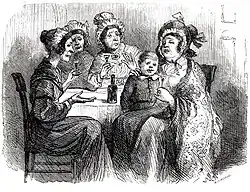 Mrs Martha Bardell is a widow, "the relict and sole executrix of a deceased custom–house officer ... a comely woman of bustling manners and agreeable appearance, with a natural genius for cooking, improved by study and long practice, into an exquisite talent."[4] With her young son she lives on Goswell Street in London where she provides lodgings for two lodgers including retired businessman Mr Pickwick, the latter taking two rooms at the front of the house.[5] Mrs Bardell develops an affection for Pickwick and regards him as a potential marriage partner. Having no servant, the hardworking landlady Mrs. Bardell looked after the needs of her young son Tommy Bardell and those of her two lodgers single-handed. Her Counsel, Mr. Serjeant Buzfuz, later described the services she provided for Pickwick: "She waited on him, attended to his comforts, cooked his meals, looked out his linen for the washer-woman when it went abroad, darned, aired, and prepared it for his wear when it came home, and, in short, enjoyed his fullest trust and confidence."[2]