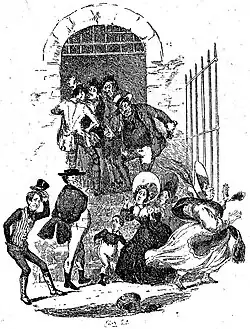 When Pickwick refuses to marry her Mrs Bardell is persuaded by the unscrupulous lawyers Dodson and Fogg into bringing a breach of promise to marry suit against Pickwick in Bardell v. Pickwick, one of the most famous fictional legal cases in English literature.[5] During the trial at the Guildhall Sittings in London before Mr. Justice Stareleigh, Mr. Serjeant Buzfuz prosecutes Pickwick and bullies the witnesses into giving incriminating testimony, leading to Pickwick being falsely convicted; he is imprisoned in the Fleet Prison for refusing to pay the fines awarded against him. Eventually Mrs. Bardell too is sent to the same prison by her attorneys for not paying their fees. Pickwick learns that the only way he can relieve her suffering is by paying her costs in the action against himself, thus at the same time releasing himself from the prison.[7][8]
