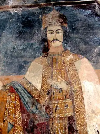 The earliest instances of the use of mtavari are in the early Georgian hagiographic texts dated to the 5th century. From the 11th to the 14th centuries, the title mtavari, along with tavadi, was synonymous with eristavi, and all referred to one of the upper nobles, a prince. Throughout the Golden Age of the Kingdom of Georgia (12th-13th centuries), the title gradually changed from conditional to hereditary tenure, a process completed only at the end of the 15th century.[1] In the 15th century the term mtavari was applied only to the five ruling princes of western Georgia (Samtskhe, Mingrelia, Guria, Svaneti, and Abkhazia),[2] whose autonomous powers were finally eliminated under Imperial Russia.