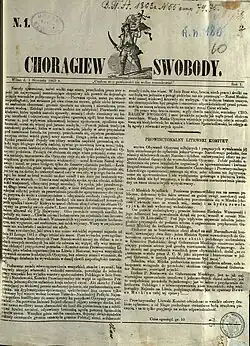 Two illegal Polish language were also printed either by Kalinowski or under his approval or patronage, The Flag of Freedom (Chorągiew Swobody) and The Voice of Litva (Głos z Litwy). The intended audience of both these newspapers was nobility; both also lack any "contentious social slogans slogans that emanated out of the periodical Mužyckaja Praŭda".[14] Three issues of The Flag of Freedom were published.[15]