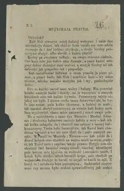 After being refused a place in civil service, Kalinowski organized a movement for liberation of his country. As a preparation for the uprising, he started to issue first newspaper in the modern Belarusian language, Mužyckaja Praūda (Peasants' Truth), under a pseudonym "Jaśko haspadar z pad Wilni" ("Jaśko, landowner from near Vilna" or "Jaśko, yeoman from near Vilna"). He worked on newspaper together with forestry officer Walery Wróblewski,[2] who was a link between the revolutionary movements in Grodno and Białystok,[3] geometer Feliks Różański, duty officer Stanisław Songin,[2][4] and Bronisław Szwarce.[5] Exact place were the newspaper was printed in unknown; it was probably done in various cities, most likely in Białystok, Grodno and Vilnius. Pisarski claimed that it was printed in Minsk.[2][6]