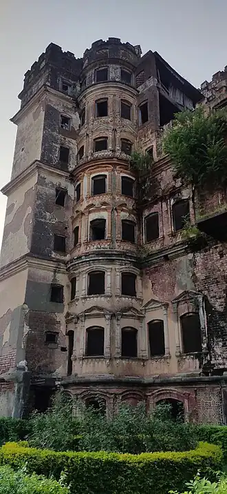 The Gol Ghar palace is a distinctive round-shaped building that overlooks the Tawi river. It has a unique circular architecture, which stands out within the palace complex. Also it combines baroque influences (the arches and columns) with Islamic influences (the domes on the top). The building is in ruins due to a fire in 1984 and an earthquake in 2005.