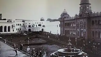 Under Maharadja Pratap Singh (1885–1925), further expansions were made, including the construction of the Rani Charak Palace in 1913, dedicated to his favourite queen, Rani Charak, a beautiful shepherd girl from Birpur village according to local legend.[2] This palace was on the eastern side of the complex, facing the river Tawi.[1] Over time, her influence over the Maharaja and his court grew significantly.[2] By the early 20th century, the Mubarak Mandi Palace complex had evolved into an expansive estate with 25 buildings spread across 12 acres and a covered area of over 400,000 square feet.[2] Notable structures within the complex include the Darbar Hall, Sheesh Mahal, Pink Palace, Royal Courts, Gol Ghar, Nawa Mahal, Hawa Mahal, Toshkhana, and the Rani Charak Palaces. Built across different periods, these buildings represent a rich blend of Rajasthani, Mughal, and European styles, reflecting the evolving aesthetic tastes of the Dogra rulers.[2]