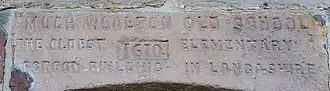 Externally, on the lintel above the building's main door, is a stone inscription which reads, "Much Woolton Old School, the oldest [1610] elementary school building in Lancashire".[5][6][7] Much doubt has been cast on this date being the exact year of construction – it may have been built earlier or later than what the engraving suggests.[8] The statement was not inscribed until ~1925 under the instruction of the local rector, George Howson.[5][9] Sources assert that whilst the "161" was original, he had the "0" added "arbitrarily" when the inscription was made.[5][9]