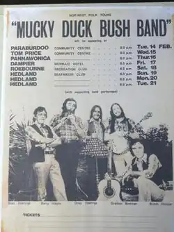 The Mucky Duck Bush Band, often called Mucky Duck, is a Western Australian Australian folk and country music band or bush band formed in 1973 and still active today, in Perth and Western Australia.[1] The band was founded by Stan Hastings, who ran the folk club The Stables in Northbridge, and his son Greg Hastings. They turned professional in 1978, touring around Western Australia.