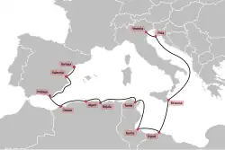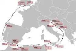 The Aigues-Mortes muda was created to increase and stabilize the commercial relations between Venice and the port cities of Medieval France and the Crown of Aragon. After landing in the major cities of the Tyrrhenian coast such as Messina, Palermo, Naples and Pisa, the muda proceeded from the Gulf of Lion making stops in the cities between Port-de-Bouc (near Marseille) and Agde, passing through Aigues-Mortes, near Montpellier. Sometimes the muda continued towards the major cities of the Crown of Aragon, landing in succession at Barcelona, Tortosa and Valencia. It was stabilized in 1412 and then decommissioned in 1494, after 82 years of activity[10] The establishment of the Aigues-Mortes muda was gradual. In July 1401, the Flanders muda left Venice for the ports of London and Bruges with a convoy of six ships, instead of the usual five. On the return journey, the additional ship separated from the convoy to reach the port of Montpellier on its own on May 15, 1402, where it would stop for eight days. The ship's captain, Lorenzo Contarini, once he had landed and obtained the necessary documents, proceeded with the transhipment of a cargo of spices worth 100,000 florins. The success of the expedition convinced the Senate to repeat the operation the following year, and the stopover was extended to fifteen days. After a few years of interruption, in 1412 the Senate established by decree the muda of Aigues-Mortes; composed of a single galley which would leave Venice at the beginning of spring and then sail along the coast of Italy and head near Montpellier towards the port of Aigues-Mortes where it would stop for eighteen days.[10].