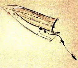 Muggiaea atlantica is a small colonial siphonophore, but one of the two nectophores (swimming bells) is undeveloped. The remaining nectophore grows to a length of about 7 mm (0.3 in). It is translucent and has five straight, longitudinal ridges, some of which may form a keel. The hydroecium (ventral cavity) is about one third of the length of the nectophore, and the long slender somatocyst (extension of the gastrovascular system) reaches the apex of the nectosac (central cavity) and sometimes contains oil droplets.[2][3] The eudoxid (reproductive stage) soon becomes detached. It has a cone-shaped, asymmetric bract with a wide flanged suture running from apex to base. The right edge of the bract is curved while the left edge is truncated horizontally. The lower surface has a small cavity in which the somatocyst is situated.[4]