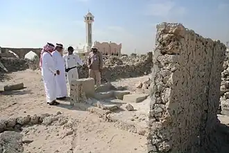 The palace remained intact until the late 1970s, when the walls began to fall down one by one.[89] After the palace collapsed, the Tourism and Antiquities Authority in the Eastern Province began cleaning and removing rubble and debris.[90] Then the process of defining the boundaries and foundations of the palace and its courtyards on the southern and eastern sides began, the excavation began where the cleaning ended, and at the same time the restoration began in the northeastern part.[91]