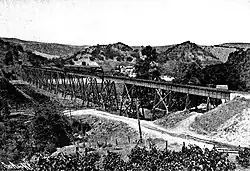 In 1897, for the sum of $10 in gold (equivalent to $378 in 2024), John Muir and Louisa Muir ceded a right of way to the San Francisco and San Joaquin Valley Railroad.[1] The agreement describes the land upon which a trestle bridge was to be located:[1] through a pear orchard.[2] The span was completed in 1899.[1] A passenger station was located at the eastern approach.[3][2]
