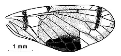 The illustration on the left shows the course of the cubitus branch and that of the 2 sub branches of the first media branch for 2 species of Muiralevu, the type species Muiralevu africanus on the top and Muiralevu rufomarginatus at the bottom. While the upper venation is found in all African species of this genus, the lower venation is found in most Asian species of the genus. In the latter case, the first media branch does not split into 2 sub branches close to its base, but some distance from the basal median cell. The illustration at the left also shows a characteristic trapezoid cell formed by a crossvein between the outer sub branch of the first media branch and the media. All Muiralevu species have such a trapezoid cell, but such a cell is also occasionally found in other genera of Rhotanini. On average, the forewings in Muiralevu are more elongated than in Saccharodite and in most other species of Rhotanini, usually more than 2 times longer than wide. On the forewings of Muiralevu, the subcosta and radius separate near the end of first costal cell, but around the middle of the 2nd costal cell in most species of Saccharodite. In addition, most species of Muiralevu show an unusual venation on the hind wings with a branched tip of the radius.[2] The forewings are not glassy like in many species of Saccharodite and are apparently carried mainly in a roof-like position when the species are at rest.[2][8]