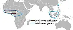 Species of Muiralevu are found in most parts of tropical West Africa. The type species, Muiralevu africanus (originally described as Levu africana Muir, 1926) has a distribution range from Sierra Leone, over the Ivory Coast, Nigeria and Cameroon to the Central African Republic. Other African species of Muiralevu have similar distribution records, but have been also described as far south as Kinshasa in the Democratic Republic of Congo.[4][5][2] In south-eastern Asia, two species have been described from Taiwan and assigned to the genus Formolevu, a synonym of Muiralevu.[3][6][7][2] Further, the distribution of Muiralevu species includes West Malaysia (5 species), Borneo (5 species) and one species each from Java and the southern tip of the Philippines (Basilan Island).[1][2]