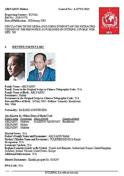 INTERPOL issued a Red Notice arrest warrant for Ablyazov, which was basis for his arrest by French authorities in 2013.[45] Interpol said Ablyazov was wanted in Russia on separate charges for "large scale fraud,” money laundering and document forgery.[46] Interpol withdrew the red notice in July 2017.