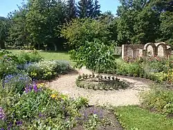 The Mulberry garden, originally Morušová zahrada in Czech, is a cottage garden in the Czech Republic, situated in the Czech Central Uplands in the village Režný Újezd, 7 kilometres (4.3 mi) northwest of the town Lovosice. The garden was established in 2014 by local gardeners admiring the English cottage garden style.[1] Apart from different kinds of plants such as perennial plants, English historical roses, Czech roses, annual plants, and bulbs, several uncommon fruit trees are grown, especially various mulberry varieties. Mulberry garden is located along the green tourist track to Boreč hill in the grounds of former Gentlemen's farm, house no. 2.