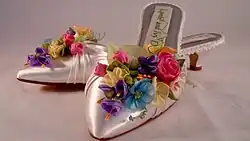 Mules also appear in eastern cultures. This history is similarly rich originating from the 800s and still present today. In eighth century Egypt, mules are depicted on gravestones and seem to be made of red kid.[13] Iranian mules from 1800 to 1889 were made of velvet, leather, silk, metal thread. They are shaped like a fish.[20] A mule from Turkey in the Metropolitan Museum's collection is made of wood, leather, metal, and silk.[21] Mules from India were made from cow, buffalo or goat hide, fur, silk, wool, or cotton fiber, velvets, brocade and reeds and grass. Similar to the European examples, mules in India were embroidered and embellished with tassels and appliqué. In South Asia, a jutti is a type of shoe that is similar to the mule because it does not have backs.[22] Sometimes, mules resemble Turkish babouche because of the use of Near Eastern fabrics. For example, Pierre Yantorny's mules designed for Rita de Acosta Lydig are made of an identical to other Near Eastern footwear. She potentially wore these shoes with a harem dress, further illustrating Eastern culture.[23]