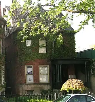 This structure is a Queen Anne townhouse,[4] one of the few remaining examples in the city of Detroit.[5] The basement is built from large stones, elevating the red brick structure well off the ground.[4] The front façade is asymmetric, with a dominating bay window on one side and a one-story porch on the other.[6] The porch features Ionic columns atop raised pedestals, and the front door has an elliptical fanlight framed by a Syrian arch.[6] Above the porch is an oval window, surrounded by decorative brickwork; other second story windows have similar decoration.[6] Two dormers with leaded windows surmount the façade.[6] The house is directly adjacent to the George W. Loomer House; the two are the only remaining buildings from the 19th century in what was at the time one of Detroit's most fashionable areas.[7]