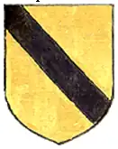 Nigel Fossard's son Robert died c.1135, Robert's son William I d. c. 1170, leaving a son William II who died in 1195 leaving an heiress Joan, who brought the barony and castle to her husband Robert de Turnham (d.1211). Their only surviving child and heiress was Isabel de Turnham who brought the barony and castle to Peter de Mauley (or Maulay) (d.1241) to whom she had been granted in marriage by King John on the escheatment of the barony. De Mauley was a native of Poitou, whose marriage to this wealthy heiress is said to have been his reward for having murdered in 1203 Prince Arthur, the son of John's elder brother who threatened his succession to the throne.[5] He was governor of Corfe Castle in Dorset where he acted as jailer of Eleanor, Arthur's sister.[6] Peter I's heir was Peter II de Mauley (1226–1279), who married Joan de Brus (d.1243), one of five sisters of Peter III de Brus (d.1272), feudal baron of Skelton, Yorkshire, who was his brother-in-law, having married Hilary de Mauley, Peter II's sister.[7] In the time of Peter II the barony was held by knight service of supplying two knights in time of war in the king's presence for 40 days per annum.[8] Peter II's heir was Peter III de Mauley (d.1308), who married Nicole de Ghent (d. before 1302), sister and in her issue co-heir (in a 1/3rd share) to Gilbert V de Ghent (d.1298), feudal baron of Folkingham, Lincolnshire.[9] Peter III was summoned to parliament by writ dated 23 June 1296,[10] creating him Baron Mauley.[11] Peter III's seal can be seen as one of 72 appended to the Barons' Letter, 1301 to the Pope"[12] sealed at the Parliament of Lincoln in January 1301, and shows him on the reverse in the usual pose for early seals holding sword and shield astride his galloping war-horse, with the tails of his surcoat swept back by the wind. His arms within a heater-shaped escutcheon show a bend with a field diapered with scroll-work, which are blazoned as borne by him on the Falkirk Roll (1298) as: Or, a bend sable.[13] His heir was Peter IV de Mauley (d.1348).[14] Camden states that the first Peter was succeeded by 7 others bearing his name.