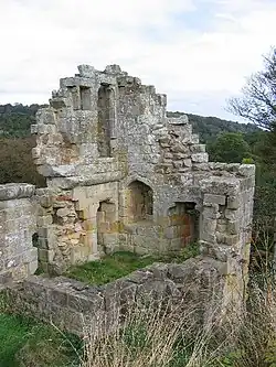 A second castle, which occupied the entire width of the ridge, seems to have been Norman, presumably constructed by Nigel Fossard (d. about 1120), who obtained the property after the Norman Conquest.[1] Fossard is recorded in the Domesday Book of 1086 as a tenant of 114 manors, all in Yorkshire, including under Robert, Count of Mortain of "Grif", identified as Mulgrave in the hundred of Langbaurgh.[2] He became himself a tenant-in-chief of the king in 1088, and a holder of the large feudal barony whose caput was at Mulgrave, hence known as the barony of Mulgrave, which according to the Cartae Baronum return made in 1166 comprised 33 1/2 knight's fees.[3] The main approach was located on the west, with two stone towers overlooking the entrance.[1] Moats prohibited approach from the east and ensured that western approach was by means of a drawbridge.[4] Differing levels of land surrounding the containing walls caused the wall to bulge outwards, which required buttressing.[1] Some of the bricks used in the structure are clearly Roman.[1]