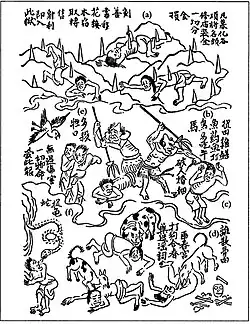 Mulian Rescues His Mother or Mulian Saves His Mother From Hell is a popular Chinese Buddhist tale first attested in a Dunhuang manuscript dating to the early 9th century CE.[1] It is an elaboration of the canonical Yulanpen Sutra which was translated from Indic sources by Dharmarakṣa sometime between 265 and 311 CE.[2] Maudgalyayana (Pali: Moggallāna), whose abbreviated Chinese transliteration is Mulian,[3] seeks the help of the Buddha to rescue his mother, who has been reborn in the preta world (in canonical sutra) or in the Avici Hell (in elaborated tale), the karmic retribution for her transgressions. Mulian cannot rescue her by his individual effort, however, but is instructed by the Buddha to offer food and gifts to monks and monasteries on the fifteenth day of the seventh lunar month, which established the Ghost Festival (Chinese: 鬼節; pinyin: guǐjié). While Mulian's devotion to his mother reassured East Asians that Buddhism did not undermine the Confucian value of filial piety and helped to make Buddhism into a Chinese religion, it also reflected strong undercurrents of filial piety that existed throughout Indian Buddhism as evidenced through its canonical texts and epigraphical remains.[4]