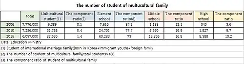 Present situation: In 2015 the number of student of multicultural family in elementary, middle, high schools is 83,000. Students of multicultural family are about 1.4% of the total students. In students of multicultural family, elementary school students are about 73%, middle school students are about 16.8%, high school students are 10.2% of the total in 2015.[10]