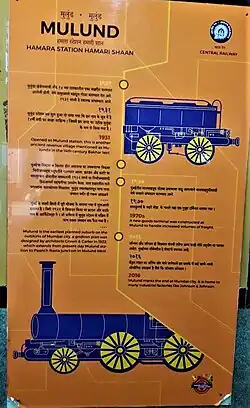 Mulund station was built to serve the suburb of Mulund, which was laid out in the 1920s. In the 1970s a new goods terminal was constructed at Mulund to handle increased volumes of freight. On 13 March 2003 a bomb exploded on a train pulling into Mulund station at 19:45 hrs. 10 people were killed and 70 injured.[1]