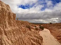 The central feature of Mungo National Park is Lake Mungo, the second largest of the ancient dry lakes. The Mungo National Park is noted for the archaeological remains discovered in the park[5] the remains of Mungo Man, the oldest human remains discovered in Australia, and Mungo Lady, the oldest known human to have been ritually cremated.[6] They were buried on the shore of Lake Mungo, beneath the 'Walls of China', a series of lunettes on the South eastern edge of the lake.