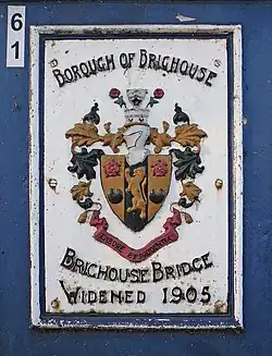 Arms were granted to the borough council in 1895, which can be seen on a plaque Brighouse Bridge and as the logo of Brighouse Town F.C. The arms are derived from the crests of the Brighouse and Rastrick families who lived in the district in the seventeenth century. The gold lion and the black crescents come from the Brighouse family and the red roses are from the crest of the Rastrick family. It is unusual to see the inclusion of red roses on the arms of a Yorkshire borough.[4]
