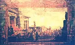 The stage curtain of the new theatre was inherited from its predecessor, Teatro di San Giacomo, and was created by an Italian artist.[1] It depicted a scene from the Odyssey where Odysseus was welcomed by King Alcinous to the land of the Phaiakes.[1]