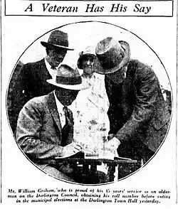 The municipality was characterised by stable, and, for the most part, non-partisan, councils, which was often in direct contrast to its neighbours: Redfern and Newtown were often divided, especially over choosing a mayor, and Camperdown Council had declared insolvency and was absorbed into Sydney City Council in 1908. Darlington had many long-serving mayors and aldermen, such as Alderman William Graham (1849–1933), who served on the council from 1887 to his death in May 1933, a record total of 47 years service which included four terms as mayor.[2][8][9] The boundaries of Darlington Council were expanded due to a transfer with Camperdown in 1906, bringing the boundary of the council up to Newtown Road. Further minor boundary transfers were made with Redfern in 1920 and Sydney in 1931.[3]