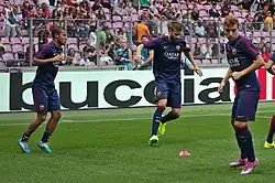 Munir was an unused substitute for their 5–4 win over Sevilla in the 2015 UEFA Super Cup on 11 August.[17] On 2 December, he scored his first Barcelona goals since his debut, scoring two in a 6–1 win over Villanovense as Barcelona advanced by the same score on aggregate in the domestic cup.[18] On 17 December, starting due to Messi and Neymar's injuries in the semi-finals of the 2015 FIFA Club World Cup in Yokohama, Munir won a penalty kick when fouled by Guangzhou Evergrande Taobao's Huang Bowen, from which Luis Suárez finished his hat-trick to send Barcelona into the final, 3–0.[19] The South American duo returned for the final, which Barcelona won 3–0 against River Plate with Munir unused.[20]